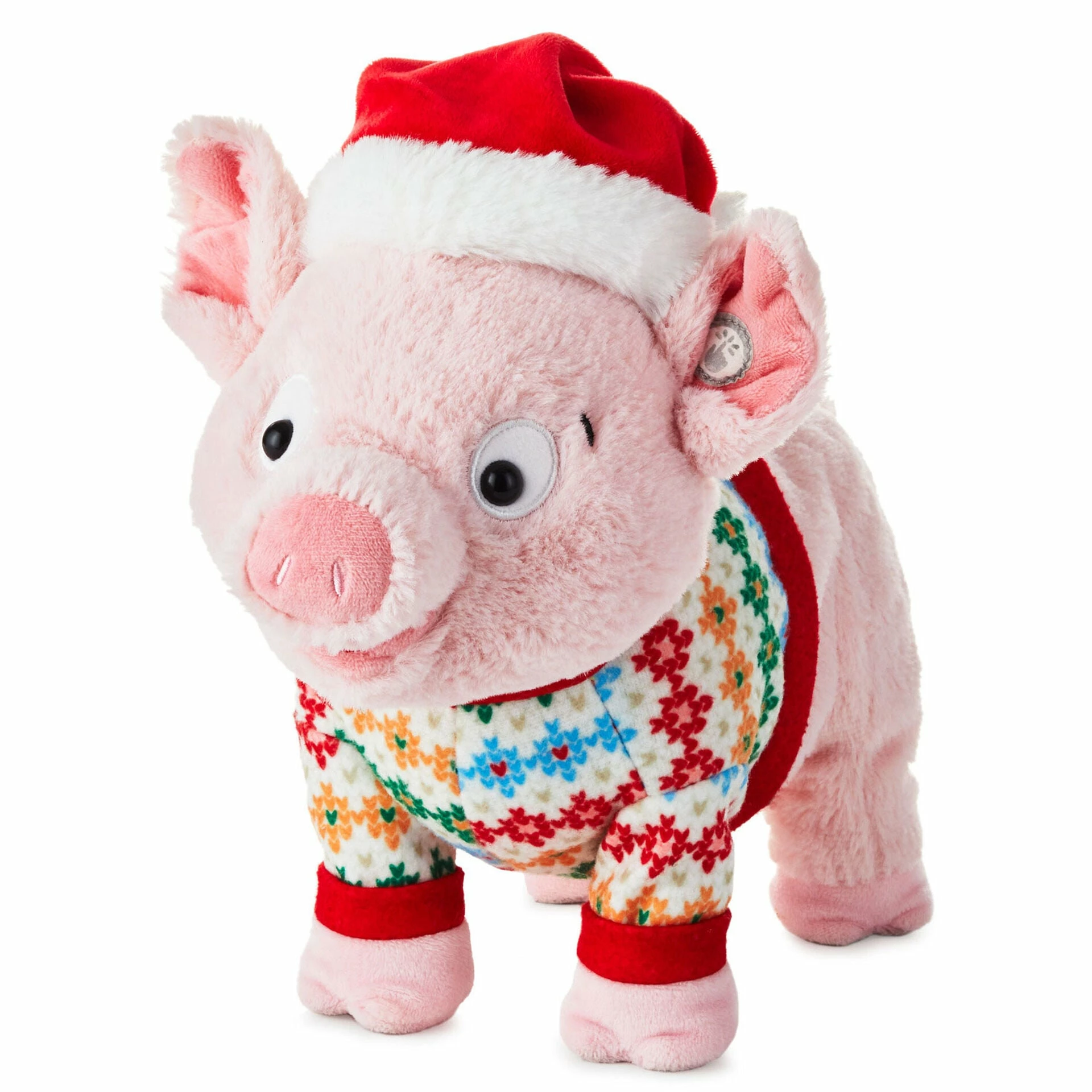 Turn tradition on its ear and take this little piggy all the way home for Christmas. He’s sure to delight your family and friends with his giggle-worthy oinks and antics. This adorable pink plush pig is dressed in a Santa hat and holiday sweater and is rarin’ to sink his chops into holiday fun. Press the button on his ear to see him snort, wiggle and squeal along to a boppin’ instrumental version of the song “Jingle Bells.”