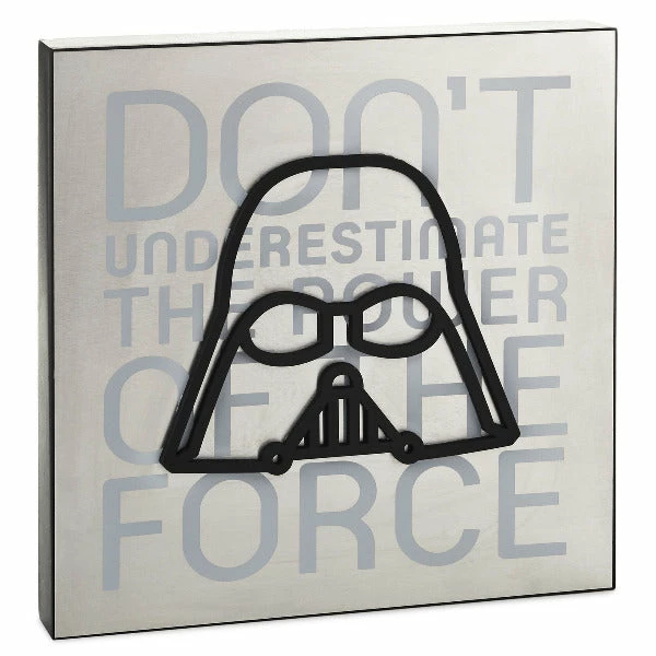 - Star Wars decorative wood sign features a brushed metal surface and laser-cut wood Darth Vader design with quote.